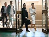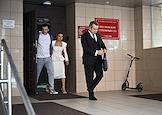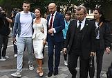 Рассмотрение ходатайства следствия об изменении меры пресечения с запрета определенных действий на домашний арест в отношении фитнес-блогера Валерии Чекалиной ("Лерчек") по делу о неуплате налогов на более чем 311 миллионов рублей и легализации денежных средств в Пресненском районном суде. Блогер Валерия Чекалина (вторая слева) и ее супруг Артем (слева) после окончания заседания суда.