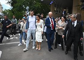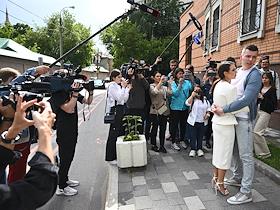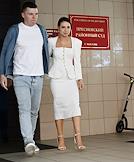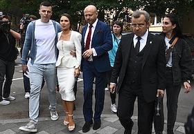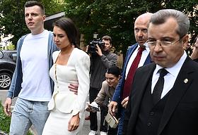 Рассмотрение ходатайства следствия об изменении меры пресечения с запрета определенных действий на домашний арест в отношении фитнес-блогера Валерии Чекалиной ("Лерчек") по делу о неуплате налогов на более чем 311 миллионов рублей и легализации денежных средств в Пресненском районном суде. Блогер Валерия Чекалина (слева) и ее супруг Артем (справа) после окончания заседания суда.