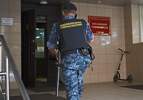 Рассмотрение ходатайства следствия об изменении меры пресечения с запрета определенных действий на домашний арест в отношении фитнес-блогера Валерии Чекалиной ("Лерчек") по делу о неуплате налогов на более чем 311 миллионов рублей и легализации денежных средств в Пресненском районном суде. Жанровая фотография. Ситуация у здания суда. Сотрудник Федеральной службы судебных приставов у входа в здание.