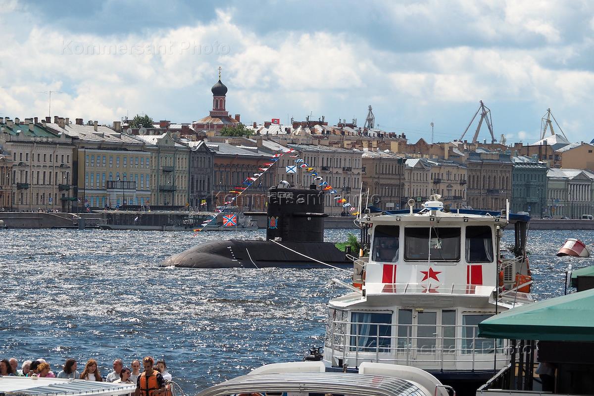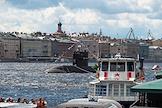 Репетиция парада ко Дню Военно-Морского флота (ВМФ) в акватории Невы. Дизель-электрическая подводная лодка "Великие Луки" проекта 677 "Лада" во время репетиции.