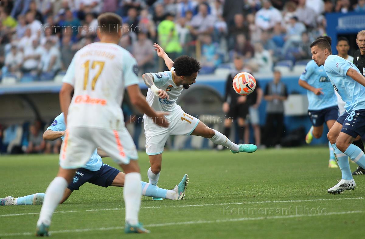 Российская Премьер-Лига (РПЛ). МИР - Чемпионат России по футболу 2023/2024. Первый тур. Матч между командами "Пари НН" (Нижний Новгород) - "Зенит" (Санкт-Петербург) на стадионе "Нижний Новгород". Игрок команды "Зенит" Клаудиньо (в центре) во время матча.