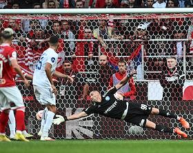 Российская Премьер-Лига (РПЛ). МИР - Чемпионат России по футболу 2023/2024. Первый тур. Матч между командами "Спартак" (Москва) - "Оренбург" (Оренбург) на стадионе "Открытие Банк Арена". Вратарь команды "Оренбург" Николай Сысуев (справа) во время матча.