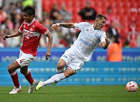 Российская Премьер-Лига (РПЛ). МИР - Чемпионат России по футболу 2023/2024. Первый тур. Матч между командами "Спартак" (Москва) - "Оренбург" (Оренбург) на стадионе "Открытие Банк Арена". Игрок команды "Спартак" Квинси Промес (справа) и игрок команды "Оренбург" Иван Башич (слева) во время матча.