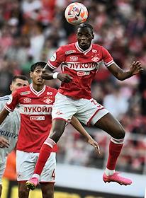Российская Премьер-Лига (РПЛ). МИР - Чемпионат России по футболу 2023/2024. Первый тур. Матч между командами "Спартак" (Москва) - "Оренбург" (Оренбург) на стадионе "Открытие Банк Арена". Игрок команды "Спартак" Виктор Мозес (справа) и игрок команды "Оренбург" Владимир Полуяхтов (в центре) во время матча.