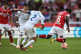 Российская Премьер-Лига (РПЛ). МИР - Чемпионат России по футболу 2023/2024. Первый тур. Матч между командами "Спартак" (Москва) - "Оренбург" (Оренбург) на стадионе "Открытие Банк Арена". Игрок команды "Спартак" Алексис Дуарте (в центре) и игрок команды "Оренбург" Дмитрий Воробьев (слева) во время матча.