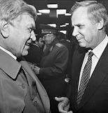 Конгресс народов СССР в здании МХАТ имени Горького. Актер Игорь Горбачев (справа) и член ЦК КПРФ Егор Лигачев (слева) во время заседания конгресса.