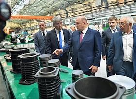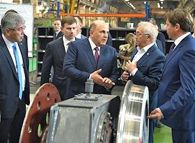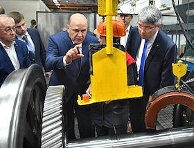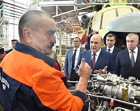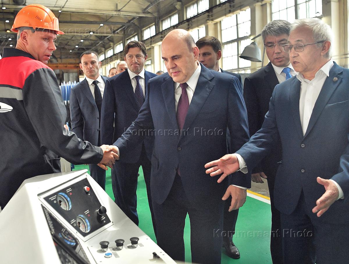 Working trip of Russian Prime Minister Mikhail Mishustin to the Far Eastern Federal District (FEFD). Russian Prime Minister Mikhail Mishustin (left) and CEO of the Ulan-Ude Aviation Plant (JSC U-UAZ) Alexei Kozlov (right) during a visit to JSC U-UAZ.