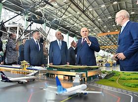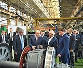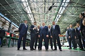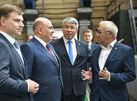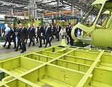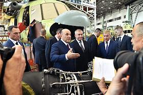 Working trip of Russian Prime Minister Mikhail Mishustin to the Far Eastern Federal District (FEFD). From left to right: Head of the Republic of Buryatia Alexei Tsydenov, Prime Minister of Russia Mikhail Mishustin, CEO of the Ulan-Ude Aviation Plant (JSC U-UAZ) Alexei Kozlov and Deputy CEO of the Russian Helicopters holding Oleg Gulyaev during a visit to JSC U-UAZ ".