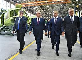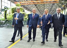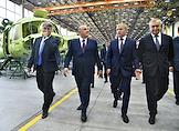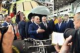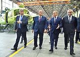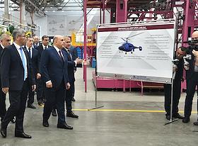 Working trip of Russian Prime Minister Mikhail Mishustin to the Far Eastern Federal District. Russian Prime Minister Mikhail Mishustin (second left), CEO of the Ulan-Ude Aviation Plant (JSC "U-UAZ") Alexei Kozlov (right) and Deputy CEO of the Russian Helicopters holding Oleg Gulyaev (center) during a visit to JSC "U -UAZ".
