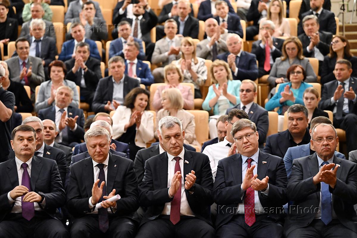 Пленарное заседание Государственной думы (ГД) России. Заместители председателя ГД России Петр Толстой (слева), Анна Кузнецова (вторая слева), Шолбан Кара-оол (справа) и председатель партии Либерально-демократическая партия России (ЛДПР), председатель комитета ГД России по международным делам Леонид Слуцкий (второй справа) во время заседания.