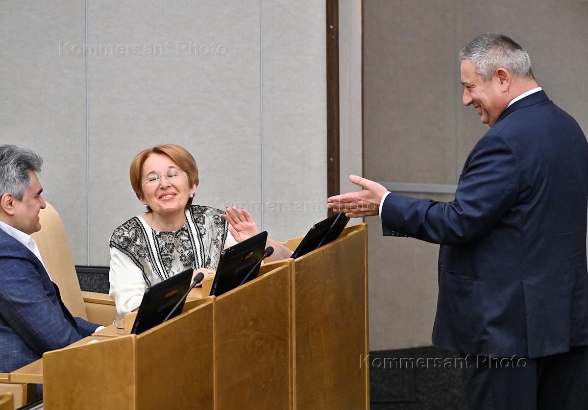 Пленарное заседание Государственной думы (ГД) России. Слева направо: руководитель фракции партии "Новые люди" в ГД России Алексей Нечаев, член комитета ГД России по бюджету и налогам Оксана Дмитриева и первый заместитель председателя комитета ГД России по бюджету и налогам Глеб Хор во время заседания.