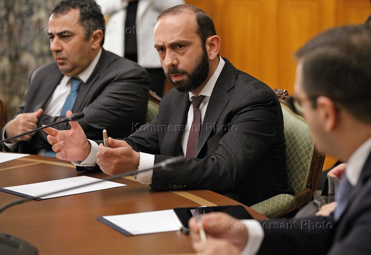 Трехсторонние переговоры министра иностранных дел России Сергея Лаврова с министрами иностранных дел Азербайджана Джейхуном Байрамовым и Армении Араратом Мирзояном в Доме приемов МИД России. Министр иностранных дел Армении Арарат Мирзоян (в центре) во время переговоров.