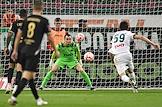 Фонбет - Кубок России по футболу 2023/24. Матч между командами "Локомотив" (Москва) - "Урал" (Екатеринбург) на стадионе "РЖД Арена". Игрок команды "Локомотив" Антон Миранчук (слева) и вратарь команды "Урал" Илья Помазун (справа) во время матча.
