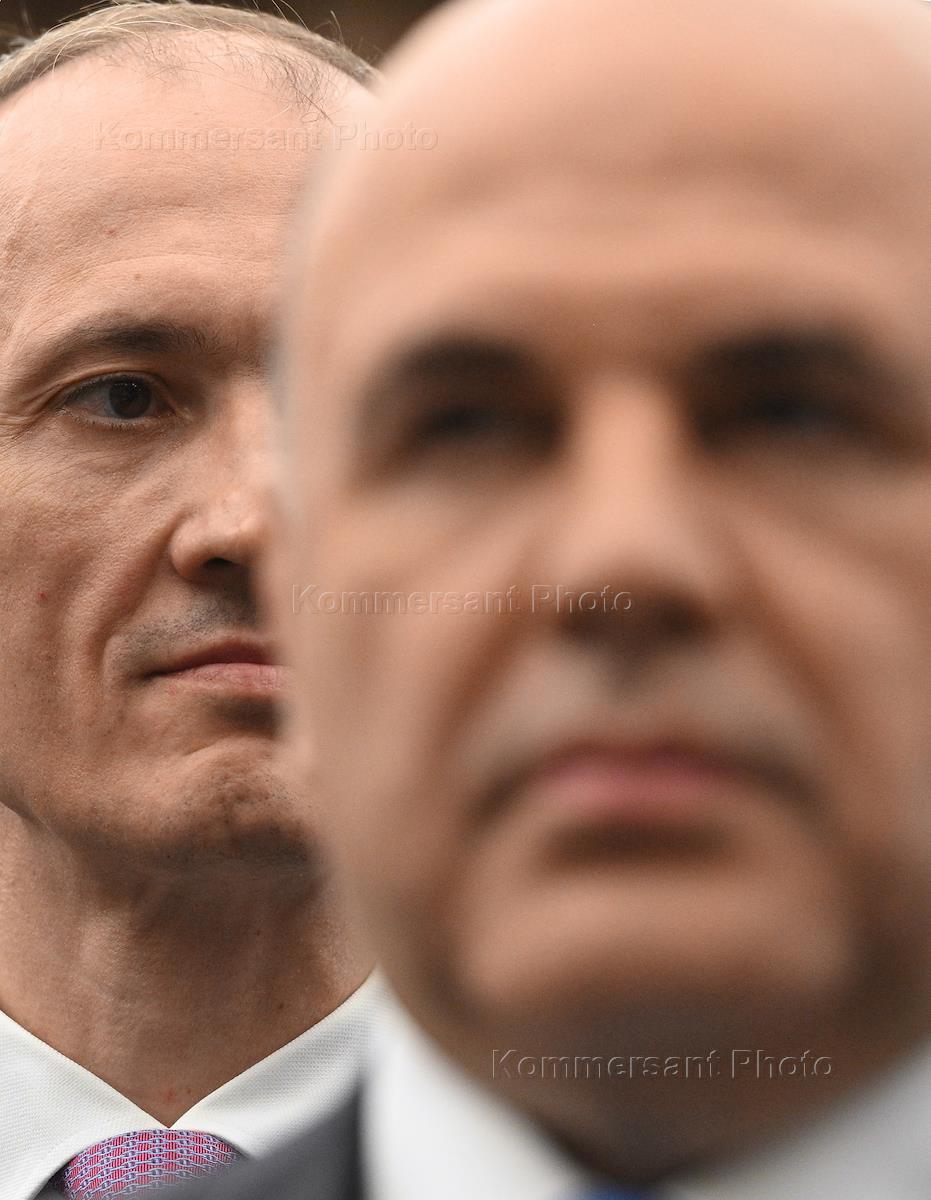 Рабочая поездка председателя правительства России Михаила Мишустина в Сибирский федеральный округ (СФО). Посещение председателем правительства России Михаилом Мишустиным всесезонного горнолыжного комплекса "Манжерок". Заместитель председателя правительства России - глава аппарата правительства России Дмитрий Григоренко (слева) и председатель правительства России Михаил Мишустин (справа) во время презентации проектов развития внутреннего туризма.