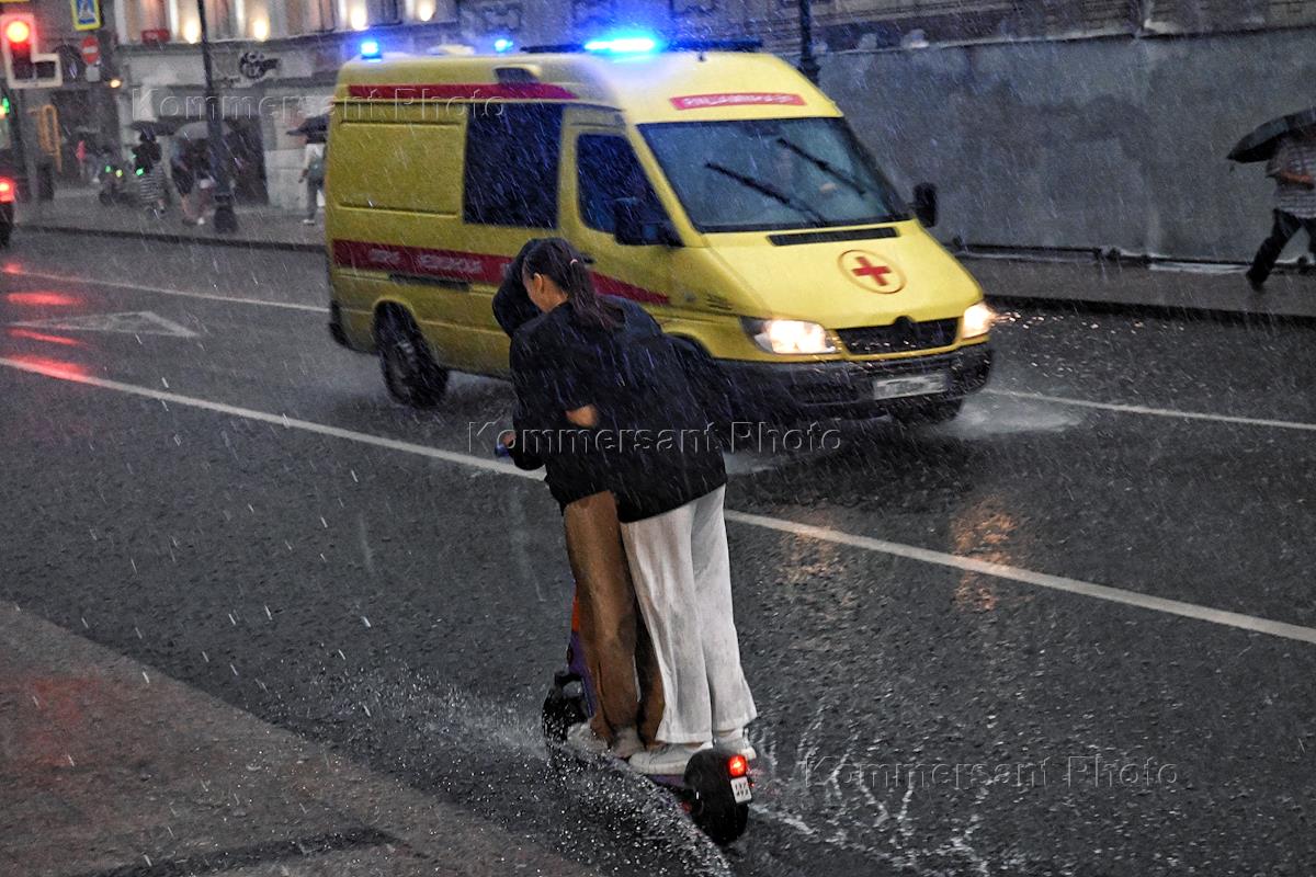 Виды Москвы во время ливня. Солянский проезд. Жанровая фотография. Молодые люди едут вдвоем на одном электросамокате.