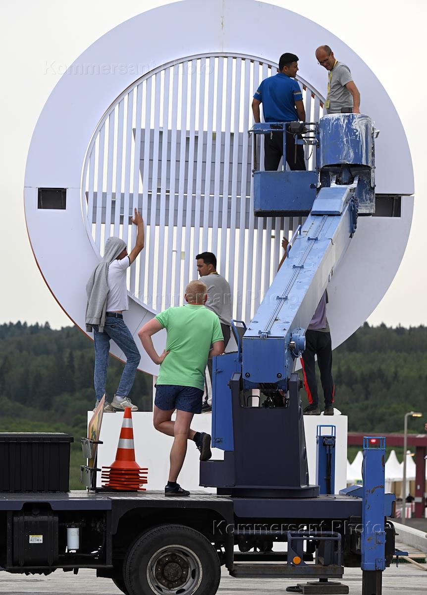 Forum "All-Russian Youth Educational Forum "Territory of Meanings" on the territory of the Management Workshop "Senezh". Genre photography. Installing the stele during preparations for the opening of the forum.