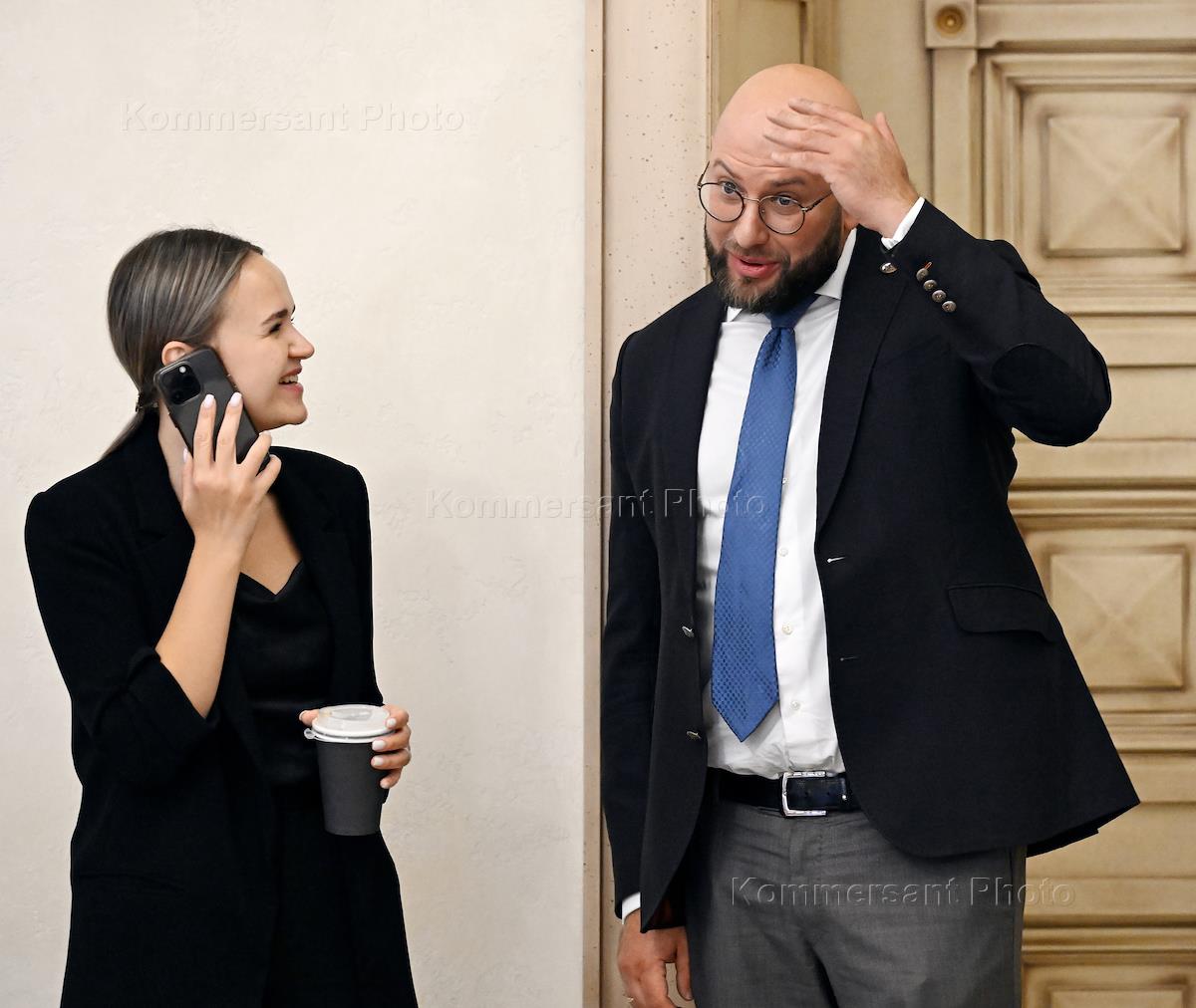 Первое заседание Координационного совета при Общественной палате (ОП) России по общественному контролю за голосованием в новом формате. Председатель Комиссии ОП России по общественному контролю и работе с обращениями граждан Алена Булгакова (слева) и член ОП города Москвы Вадим Ковалев (справа) перед началом заседания.