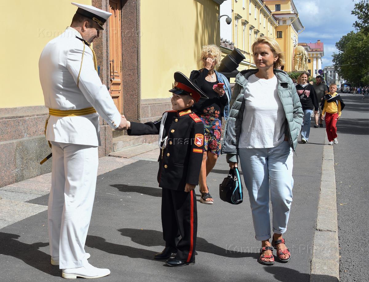 Жанровая фотография. Репетиция парада ко Дню Военно-морского флота (ВМФ) на Адмиралтейской набережной. Военный после репетиция на улице с суворовцем.