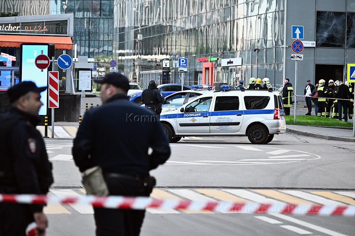 Последствия атаки беспилотников на Московский международный деловой центр "Москва-Сити". Два беспилотника подавили средства радиоэлектронной борьбы и они упали на территории "Москва-Сити" и при падении повредили фасады двух башен. Сотрудники пожарно-спасательного центра МЧС и Росгвардии на месте происшествия.