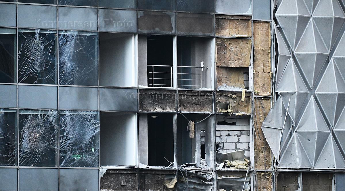 Consequences of a drone attack on the Moscow International Business Center "Moscow City". Two drones suppressed electronic warfare equipment and they fell on the territory of Moscow City and damaged the facades of two towers during the fall. Damaged facade of one of the buildings.