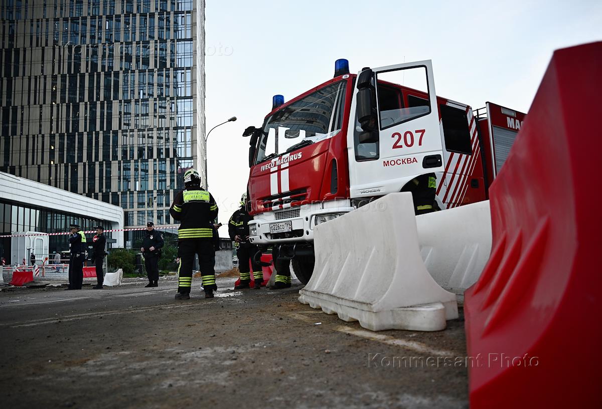 Последствия атаки беспилотников на Московский международный деловой центр "Москва-Сити". Два беспилотника подавили средства радиоэлектронной борьбы и они упали на территории "Москва-Сити" и при падении повредили фасады двух башен. Сотрудники пожарно-спасательного центра МЧС на месте происшествия.