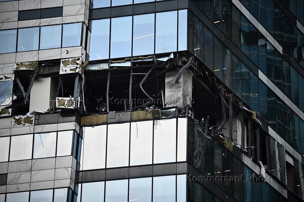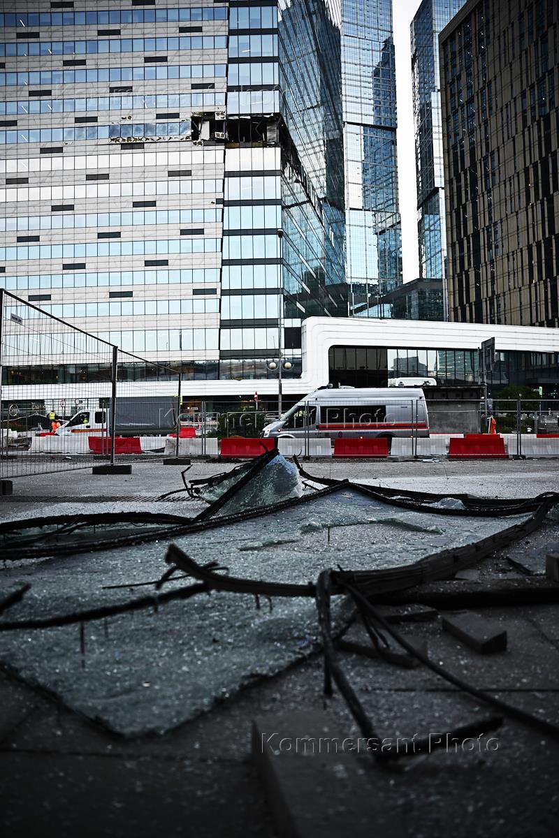 Последствия атаки беспилотников на Московский международный деловой центр "Москва-Сити". Два беспилотника подавили средства радиоэлектронной борьбы и они упали на территории "Москва-Сити" и при падении повредили фасады двух башен.