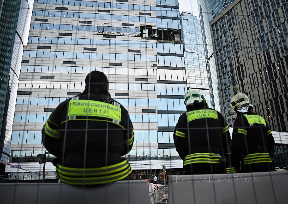Последствия атаки беспилотников на Московский международный деловой центр "Москва-Сити". Два беспилотника подавили средства радиоэлектронной борьбы и они упали на территории "Москва-Сити" и при падении повредили фасады двух башен. Сотрудники пожарно-спасательного центра МЧС на месте происшествия.