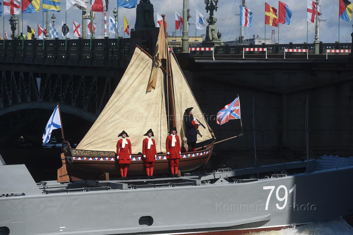 Главный военно-морской парад в честь Дня Военно-морского флота (ВМФ) России в акватории реки Невы в Санкт-Петербурге. Десантный катер Балтийского флота "Алексей Баринов" с ботиком Петра I во время парада.