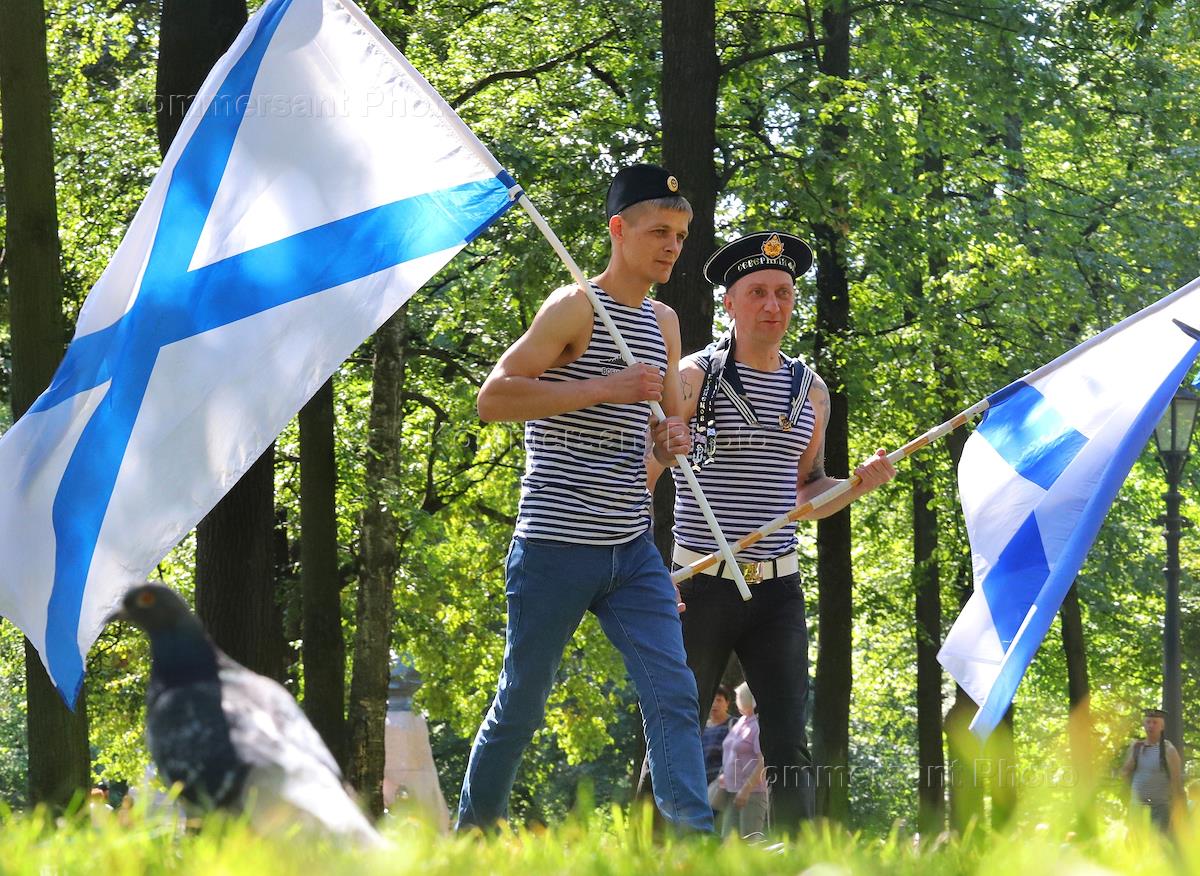 Празднование Дня Военно-морского флота (ВМФ) России в Санкт-Петербурге. Ветераны ВМФ с андреевским флагом в парке во время праздничных гуляний.