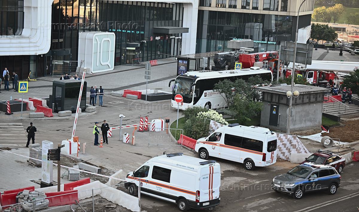 The aftermath of a drone attack on the IQ-quarter tower in the Moscow International Business Center Moscow City. Employees of the Ministry of Emergency Situations of Russia and law enforcement agencies on the square near the tower.
