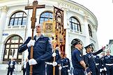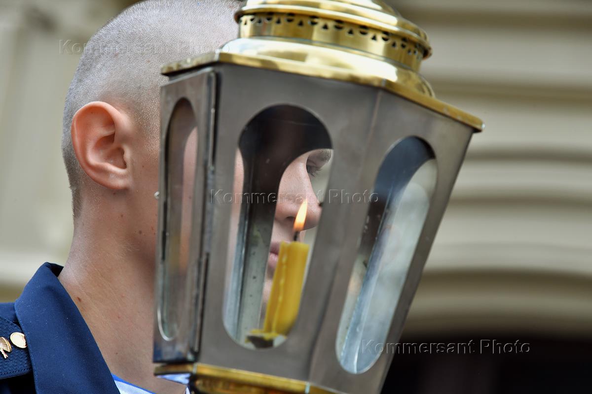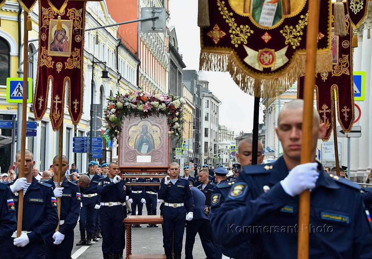 Праздничные мероприятия, посвященные 93-й годовщине создания Воздушно-десантных войск (ВДВ) России, на Красной площади. День ВДВ России отмечают 2 августа в день памяти пророка Илии, небесного покровителя Воздушно-десантных войск. Жанровая фотография. Участник Крестного хода из храма Пророка Божия Илии в Китай-городе до Лобного места на Красной площади.