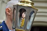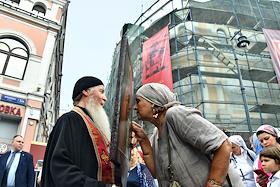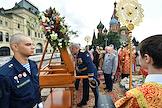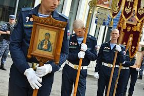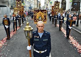 Праздничные мероприятия, посвященные 93-й годовщине создания Воздушно-десантных войск (ВДВ) России, на Красной площади. День ВДВ России отмечают 2 августа в день памяти пророка Илии, небесного покровителя Воздушно-десантных войск. Жанровая фотография. Участник Крестного хода из храма Пророка Божия Илии в Китай-городе до Лобного места на Красной площади.