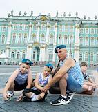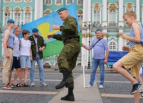 Праздничные мероприятия, посвященные 93-й годовщине создания Воздушно-десантных войск (ВДВ) России. Бывший десантник с детьми во время гуляния на Дворцовой площади.