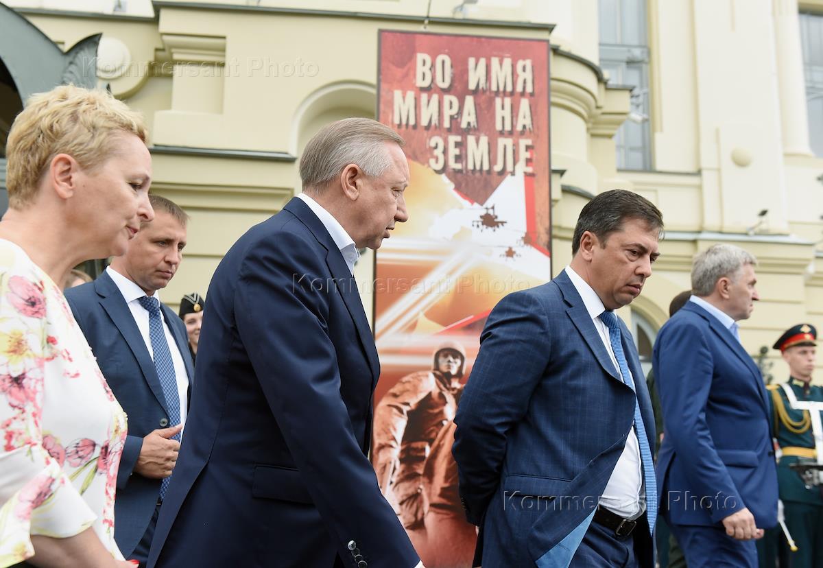 Церемония проводов петербуржцев, заключивших контракт с Министерством обороны (МО) России для прохождения службы в зоне специальной военной операции (СВО). Церемония состоялась на Витебском железнодорожном вокзале. Губернатор Санкт-Петербурга Александр Беглов (справа) во время церемонии.