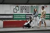 Виды Москвы. Жанровая фотография. Семья с ребенком идут мимо рекламного баннера компании КрашМаш.