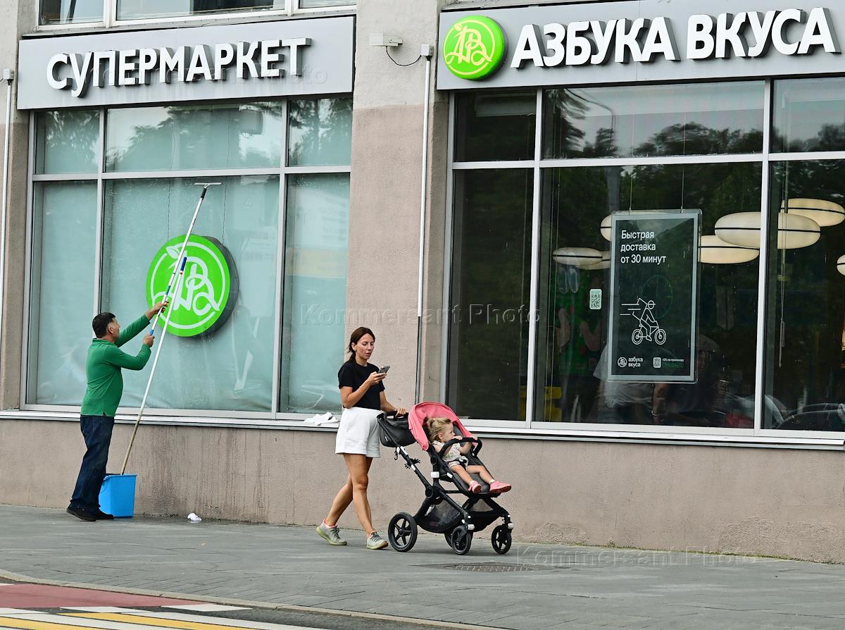 Жанровая фотография. Витрина супермаркета "Азбука вкуса". Мама с ребенком в коляске едет у супермаркета.