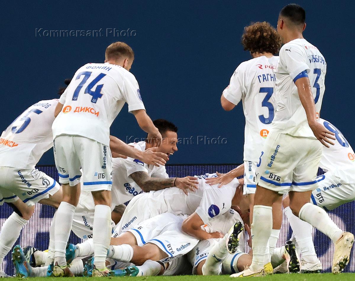 Российская Премьер-Лига (РПЛ). МИР - Чемпионат России по футболу 2023/2024. Третий тур. Матч между командами "Зенит" (Санкт-Петербург) - "Динамо" (Москва) на стадионе "Газпром Арена". Игроки команды "Динамо" во время матча.