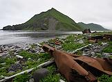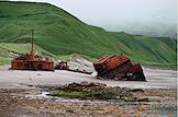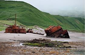 Виды Курильских островов. Жанровая фотография. Выброшенный корабль в бухте Токотан на острове Уруп.