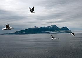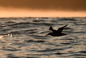Виды Курильских островов. Жанровая фотография. Птица Альбатрос летит над морем.