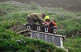 Виды Курильских островов. Лежбище сивучей на острове Брат-Чирпоев. Жанровая фотография. Ученые биологи снимают информацию и обслуживают фотоловушки установленные для наблюдения над лежбищем.