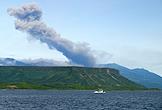 Виды Курильских островов. Жанровая фотография. Выброс пепла вулкана Эбеко на острове Парамушир. Рыболовное судно в море.