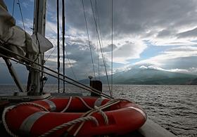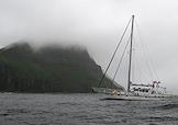 Виды Курильских островов. Жанровая фотография. Яхта у острова Симушир.