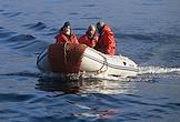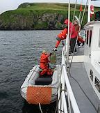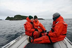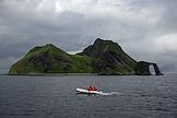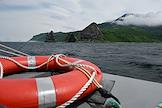 Виды Курильских островов. Жанровая фотография. Остров Онекотан. ученые плывут на лодке по морю у берега острова.