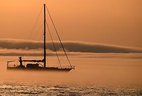Виды Курильских островов. Жанровая фотография. Яхта на закате в бухте Токотан у острова Уруп.