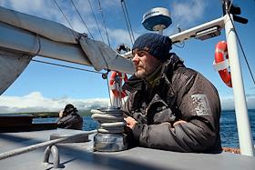 Виды Курильских островов. Жанровая фотография. Участник экспедиции на яхте во время наблюдения за каланами и морскими млекопитающими.
