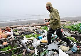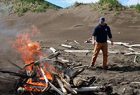 Виды Курильских островов. Жанровая фотография. Участник экспедиции проводит сбор, подсчет и изучение состава и сжигание выброшенного на берег мусора на острове Уруп.