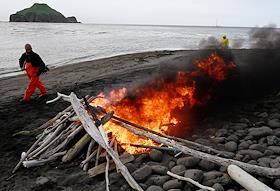 Виды Курильских островов. Жанровая фотография. Участники экспедиции проводят сбор, подсчет и изучение состава и сжигание выброшенного на берег мусора острова Уруп.