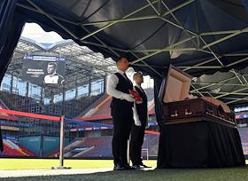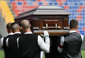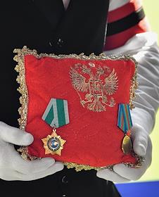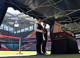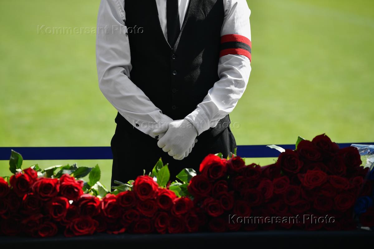 Церемония прощания с бывшим вратарем футбольного клуба ЦСКА и сборной России по футболу Вениамином Мандрыкиным на стадионе "ВЭБ Арена". Жанровая фотография. Награды Вениамина Мандрыкина.