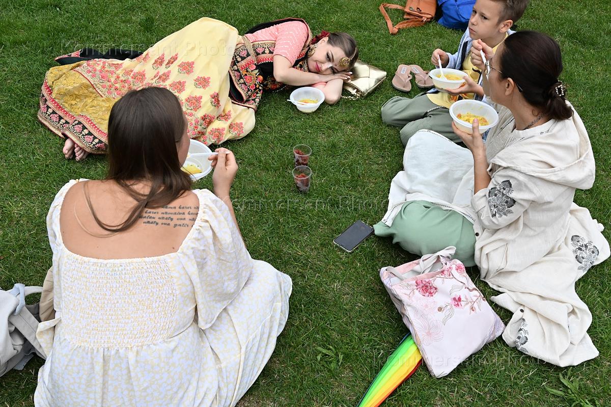 VIII Этнический фестиваль "День Индии" в южном ландшафтном парке аттракционов "Остров Мечты". Жанровая фотография. Зрители фестиваля отдыхают на газоне.
