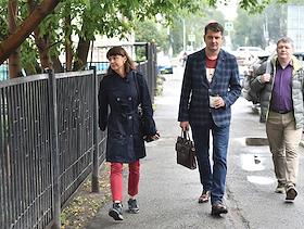 Заседание суда по делу депутата городской Думы Томска, бывшего координатора Томского штаба Алексея Навального (признан в России иноагентом) Ксении Фадеевой, обвиняемой в организации экстремистского сообщества и участии в НКО, нарушающей права граждан, в Советском районном суде. Депутат городской Думы Томска Ксения Фадеева (в центре) и адвокат Семен Воднев (слева) после окончания заседания.